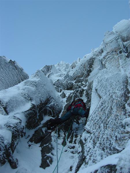 Zimowa wspinaczka klasyczna w Śnieżnych Kotłach, Mountain Maniek na drodze Diretissima Turni Popiela M6