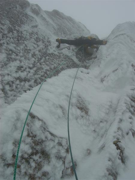 Zimowa wspinaczka klasyczna w Śnieżnych Kotłach, Maniek na pierwszym wyciągu drogi Ostrzem prawego filara M5+/6.